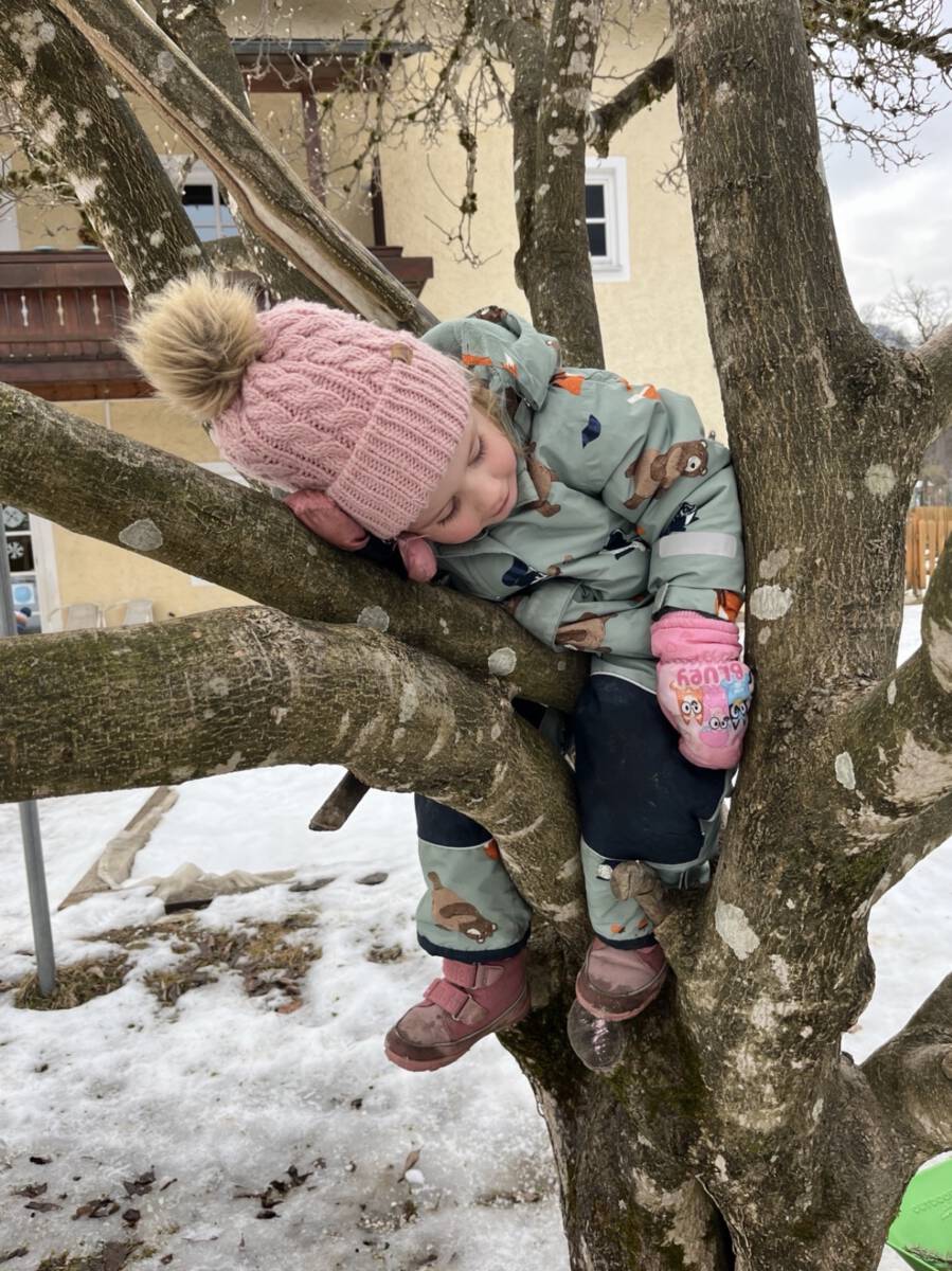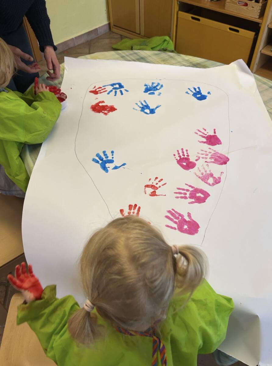 Wir entdecken Farbe mit Handabdrücken und ruhen uns anschließend im Baum aus.